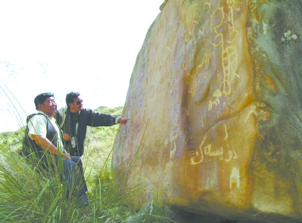 ■中国社会科学院民族文学研究所托忒文学术团队成员叶尔达在新疆考察刻有托忒文的岩石