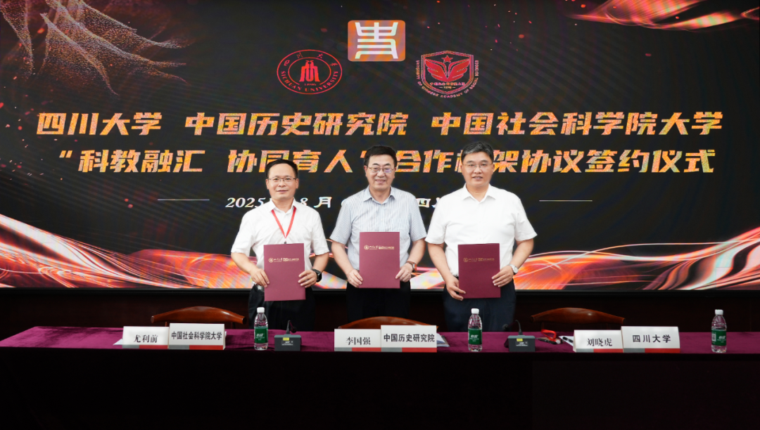 2025年8月6日,四川大学、中国历史研究院、中国社会科学院大学“科教融汇 协同育人”合作框架协议签约仪式暨2025年度暑期学校开班仪式在四川大学文学与新闻学院大楼举行。中国社会科学院学部委员,中国历史研究院党委常委、副院长,中国社会科学院大学历史学院院长李国强,四川大学党委副书记刘晓虎,中国社会科学院大学纪委书记、副校长尤利前出席。