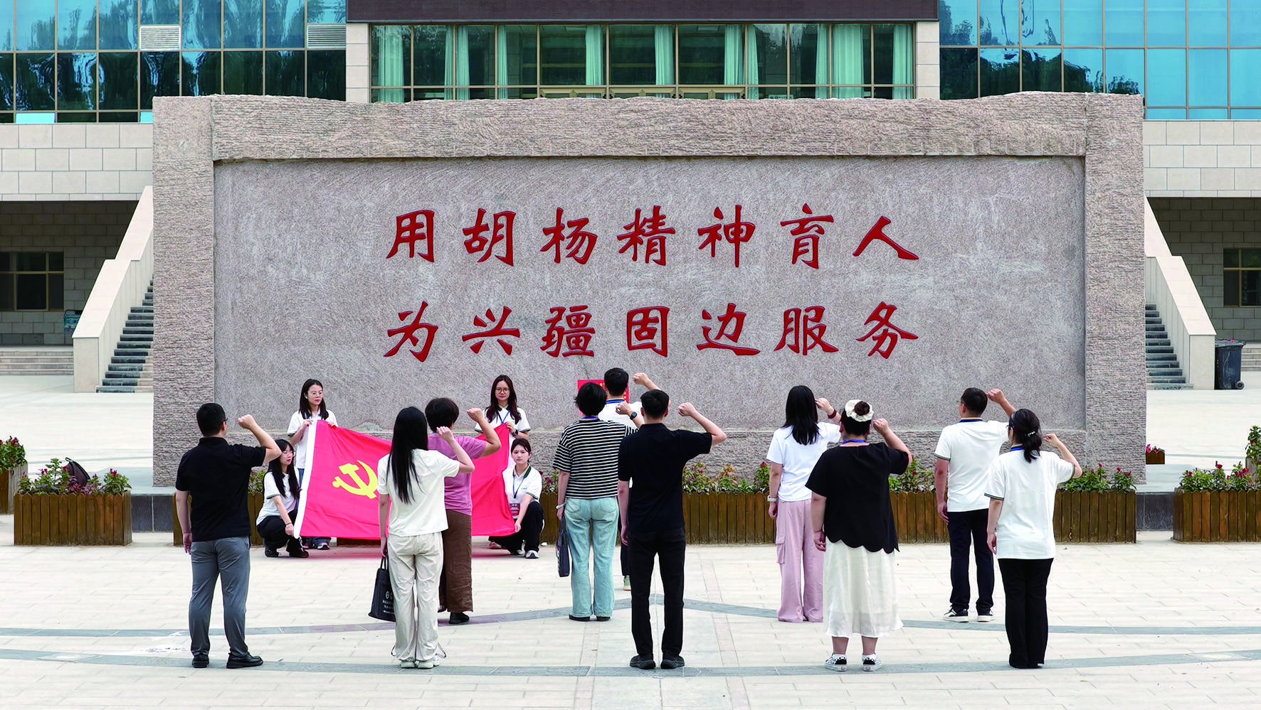 ■调研组临时党支部在塔里木大学“用胡杨精神育人,为兴疆固边服务”标语下重温入党誓词。作者/供图