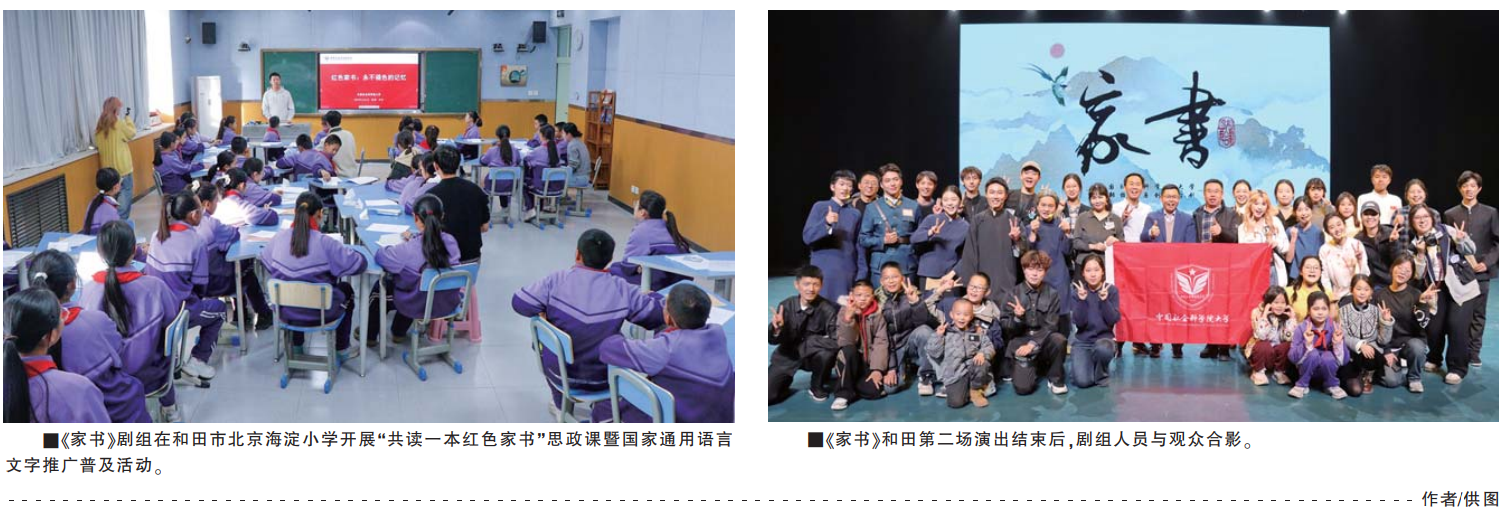 在观众席中,我看见了几位熟悉的面孔,他们是和田市北京海淀小学的学生。演出前一天,我们来到这所学校,与师生们共同开展“共读一本红色家书”思政课暨国家通用语言文字推广普及活动。在听完冷少农的生平后,六年级的何浩然同学说出了自己的感想:“老师,冷少农英雄是舍‘小家’为‘大家’,只有‘大家’好,‘小家’才会更好!”在舞台上再次想起这句话的一刻,我手中薄薄的信纸仿佛重若千钧。几千公里的跋涉,我们把故事带到了这里,而这片土地也教会了我们什么是真正的抵达。这份抵达,是社科大青年学子放下“书生气”,沾上“泥土香”的成长,是学术理想与家国情怀的双向奔赴。